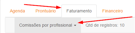 Relatórios >> aba AGENDA >> opção COMISSÃO POR PROFISSIONAL